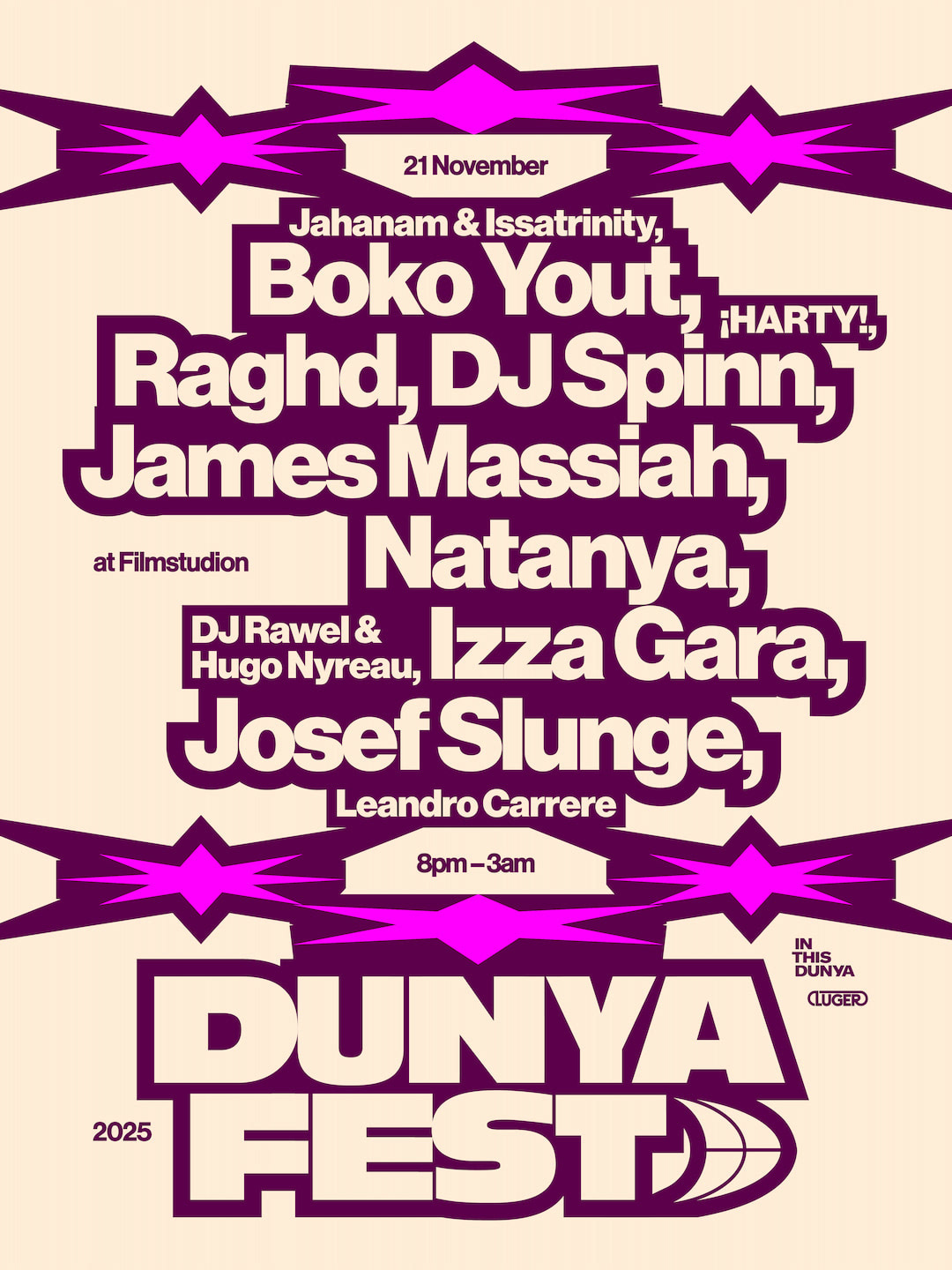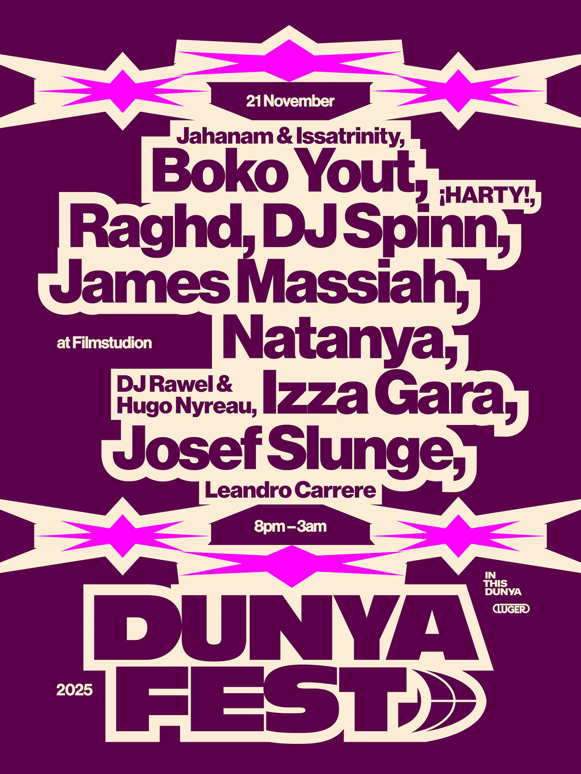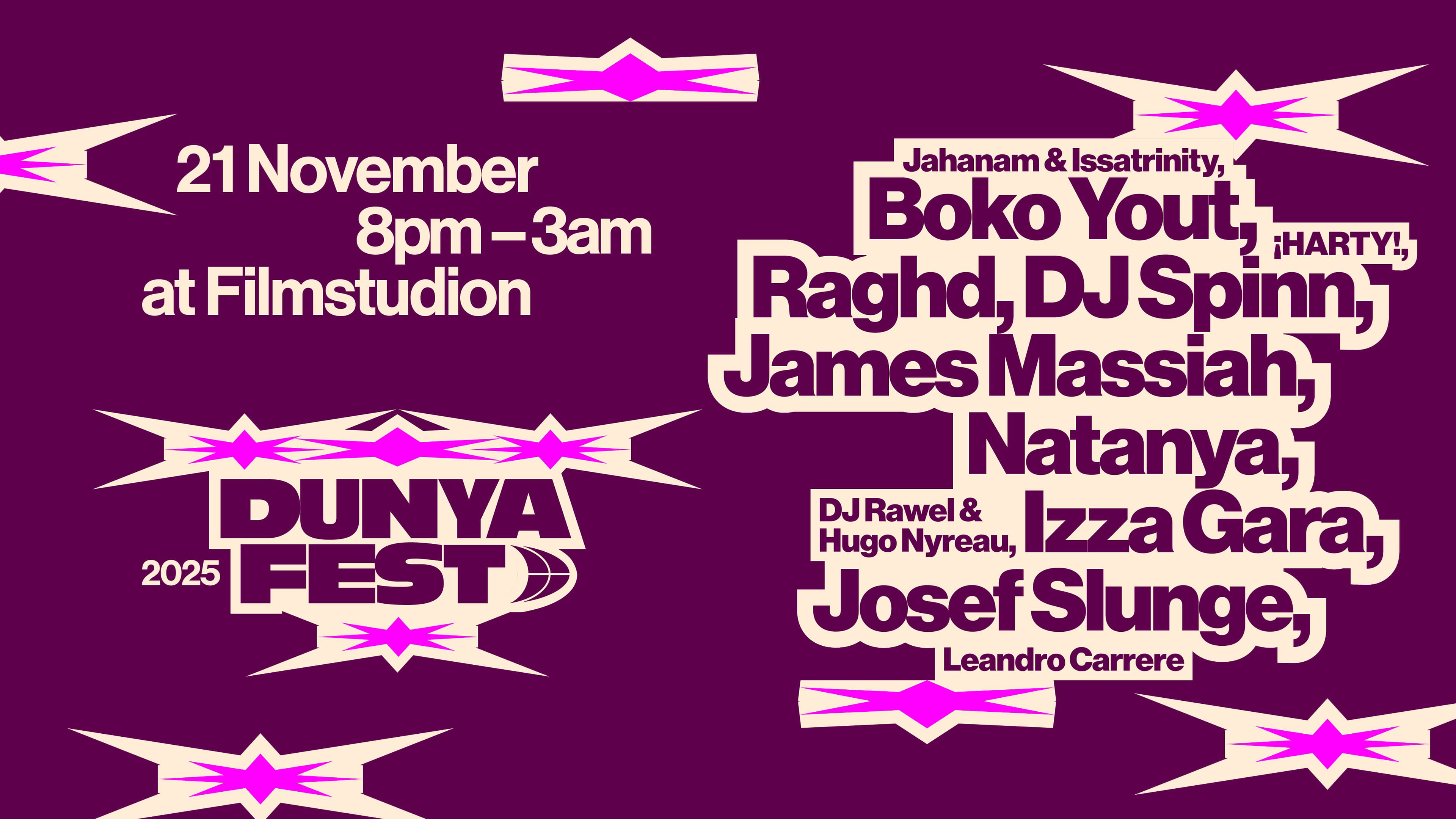 Graphic design, animation and music production for the music festival Dunya Fest 2025. Artist line up poster for print and social media, website assets, videos for social media ads, artist announcements, and music production for this years theme song. The design was based on Johanna Burais visual identity for Dunya Fest 2024.